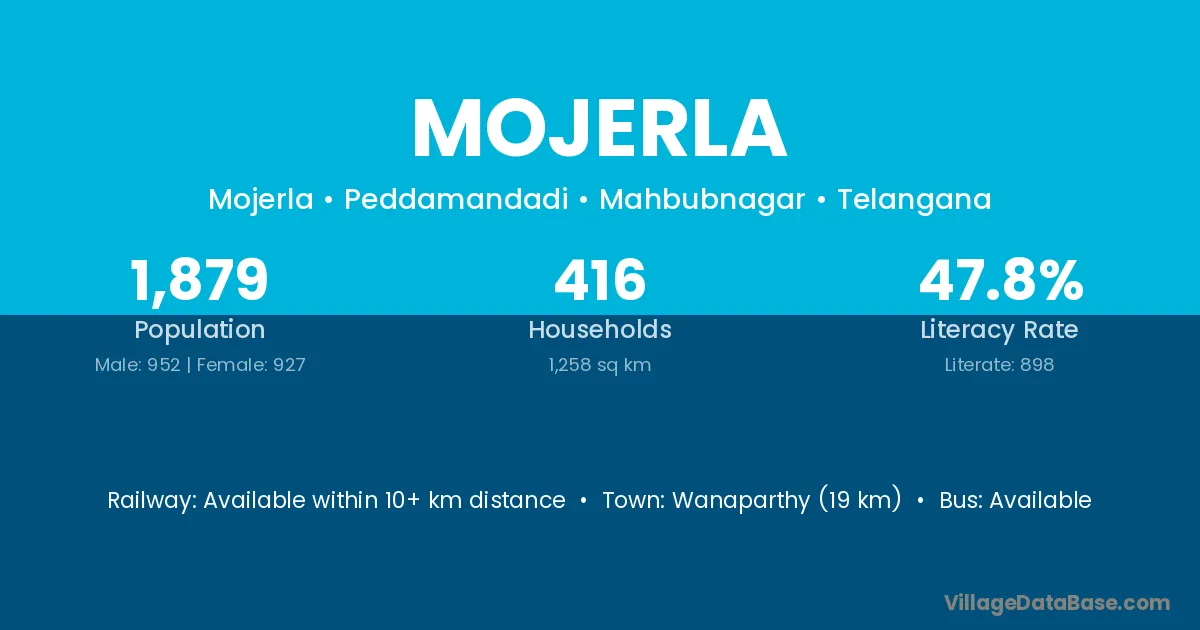 Wanaparthy (19 km) is the nearest town to Mojerla village for major economic activities and is located approximately 19 km away.