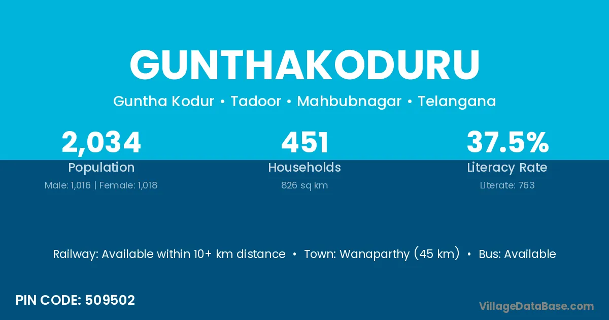 Wanaparthy (45 km) is the nearest town to Gunthakoduru village for major economic activities and is located approximately 45 km away.