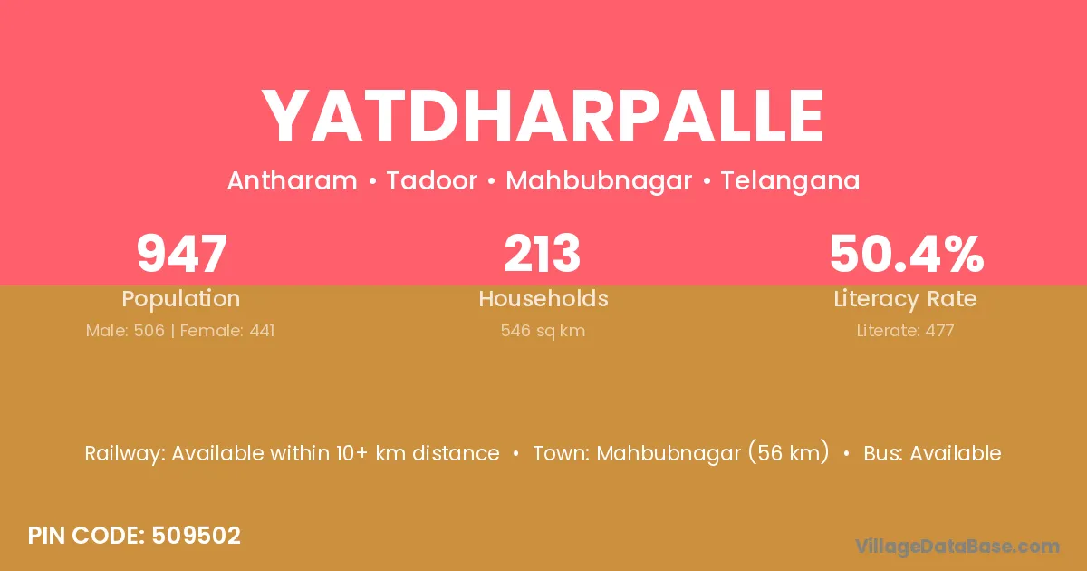 Yatdharpalle village has a total population of 947 people, of which 506 are males and 441 are females.