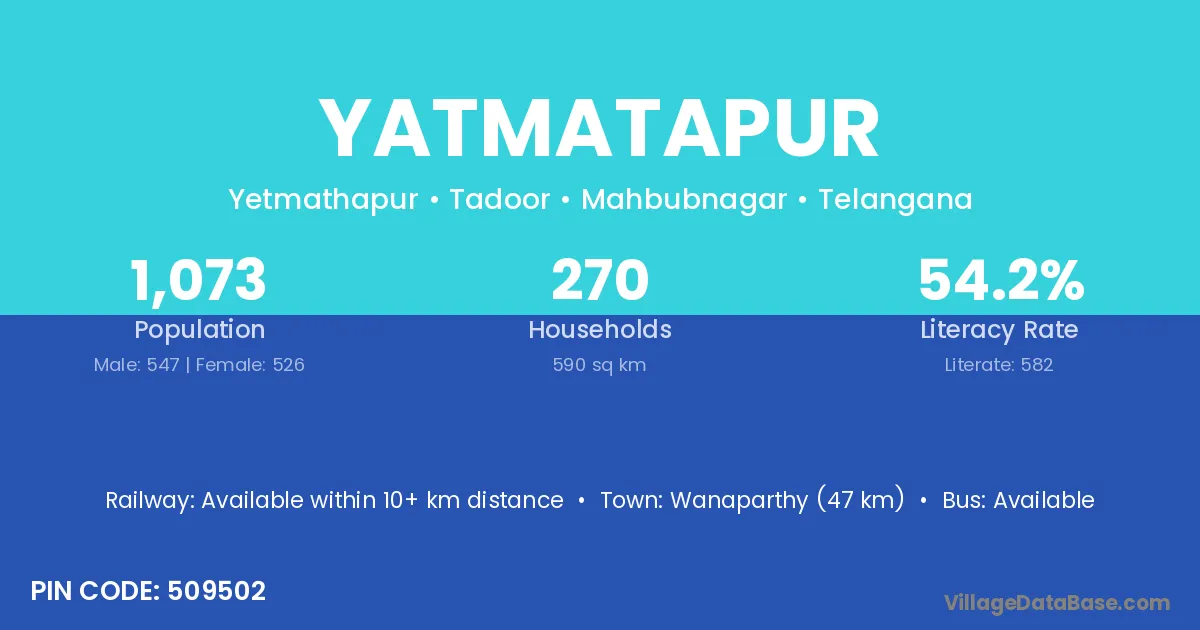 Wanaparthy (47 km) is the nearest town to Yatmatapur village for major economic activities and is located approximately 47 km away.
