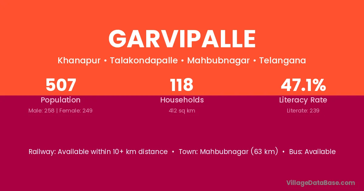 Mahbubnagar (63 km) is the nearest town to Garvipalle village for major economic activities and is located approximately 63 km away.
