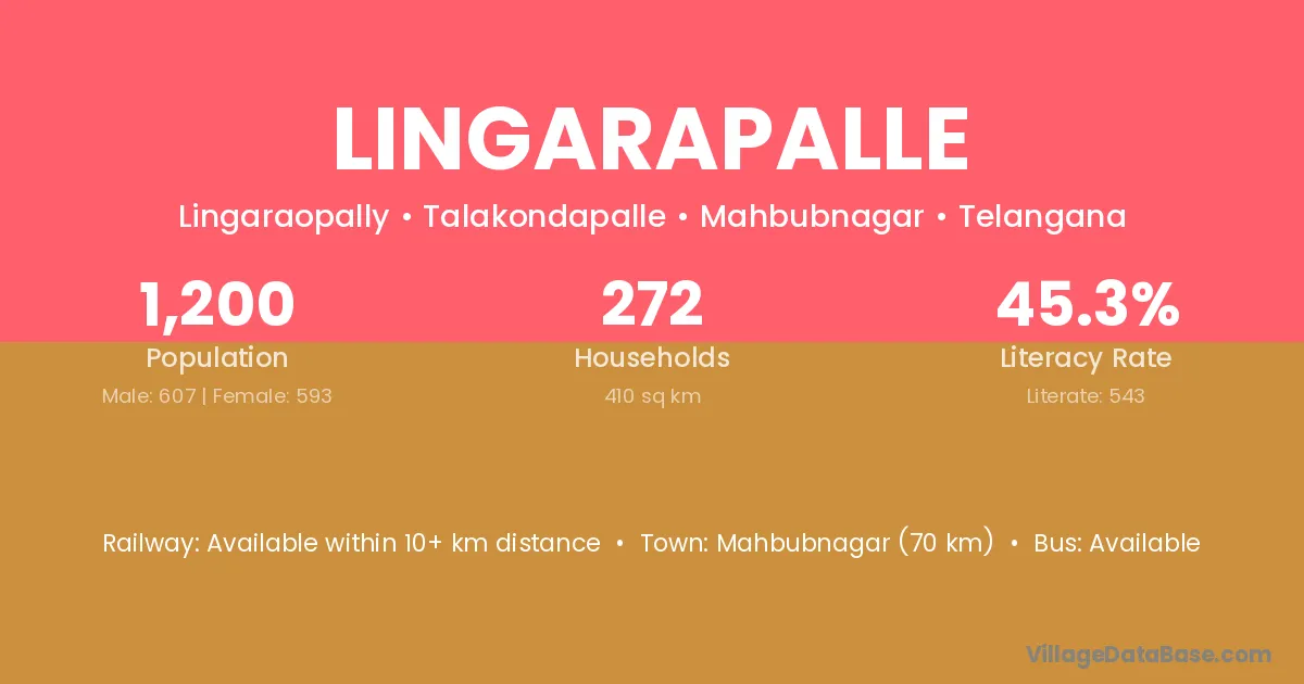 Mahbubnagar (70 km) is the nearest town to Lingarapalle village for major economic activities and is located approximately 70 km away.