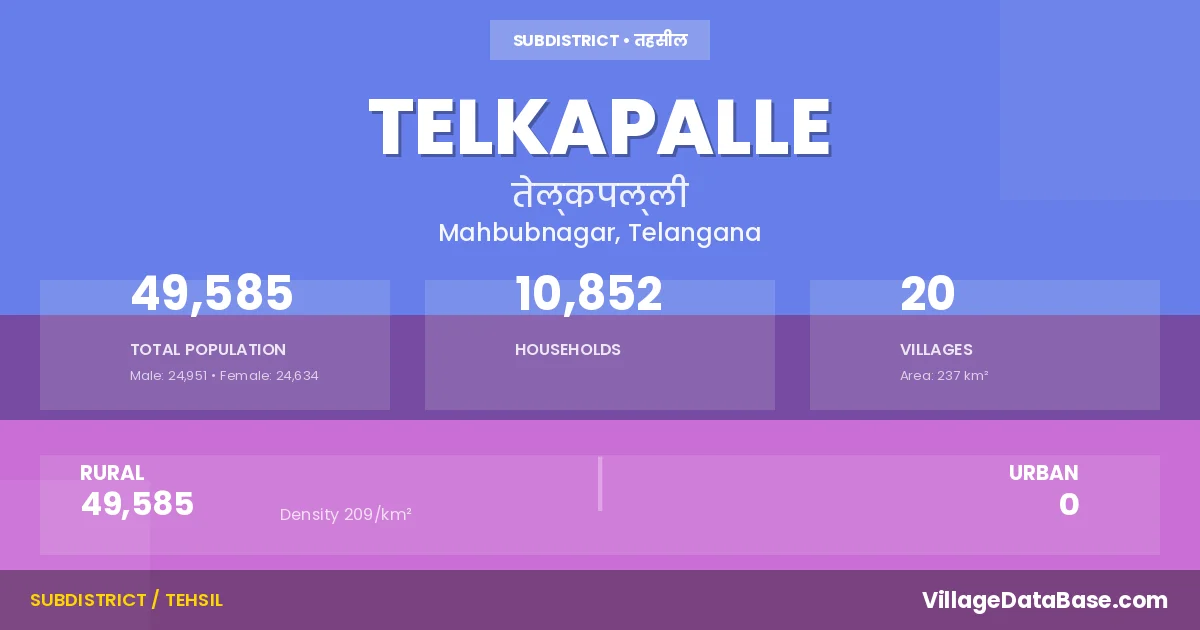 Telkapalle is a town and Mandal in the Mahbubnagar district of the Telangana. In India, a Mandal is a subdivision of a district responsible for the administration and revenue collection of a specific area within the district. Mandals play a crucial role in the local governance structure, contributing significantly to the development and administration of their communities.
