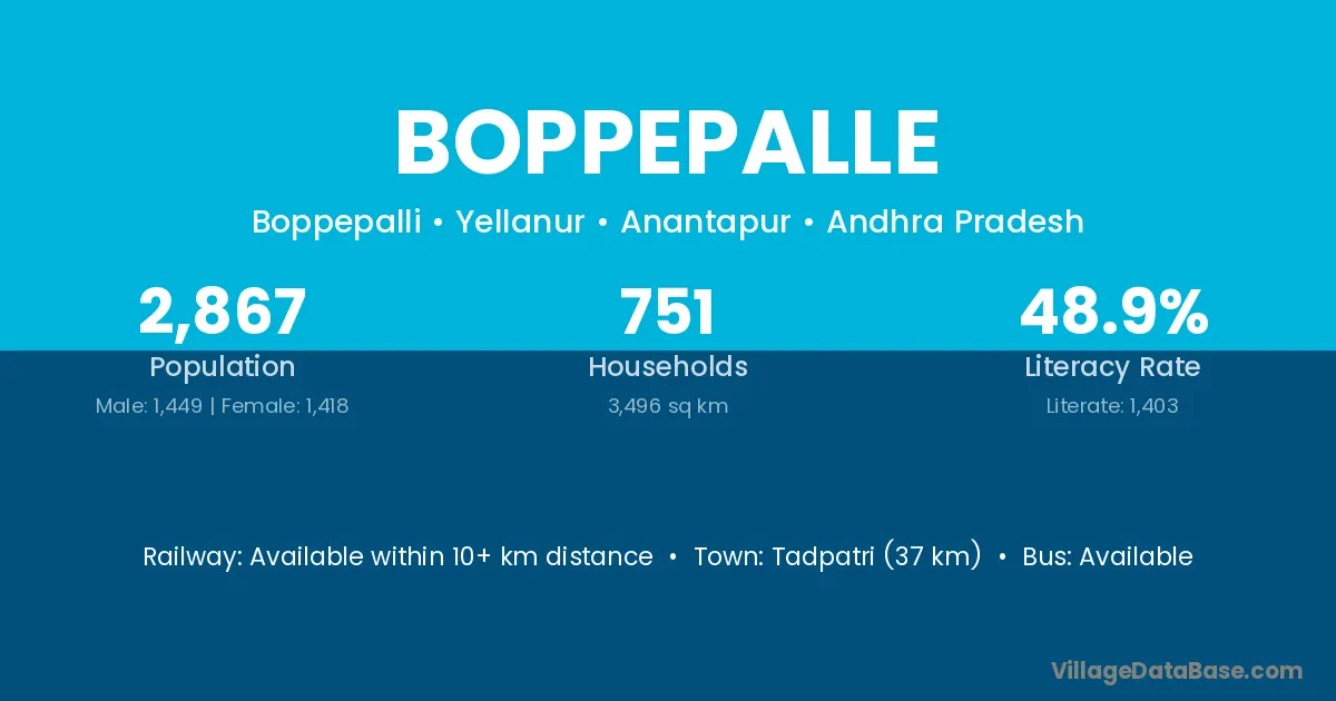 Wanaparthy (39 km) is the nearest town to Boppepalle village for major economic activities and is located approximately 39 km away.