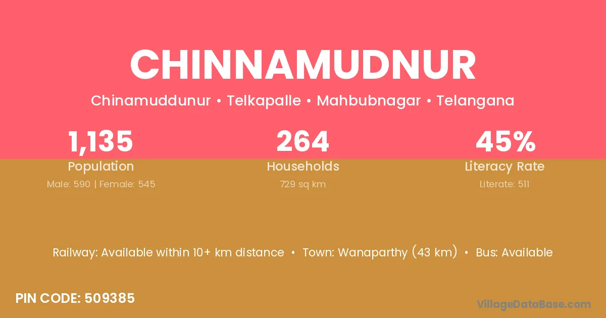 Wanaparthy (43 km) is the nearest town to Chinnamudnur village for major economic activities and is located approximately 43 km away.