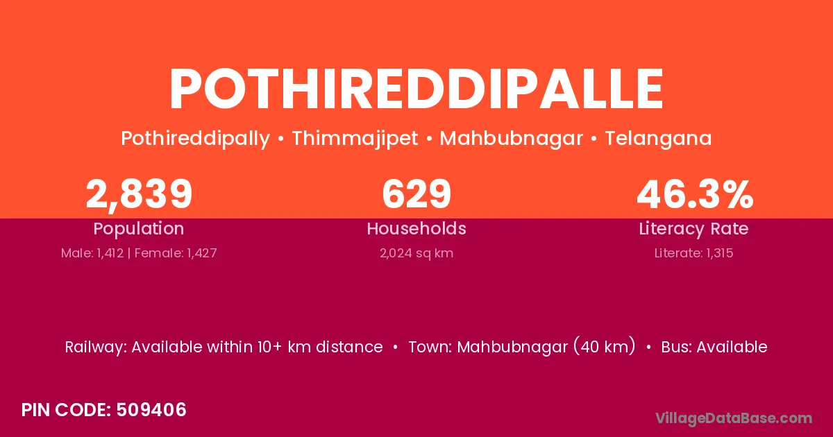 Mahbubnagar (40 km) is the nearest town to Pothireddipalle village for major economic activities and is located approximately 40 km away.