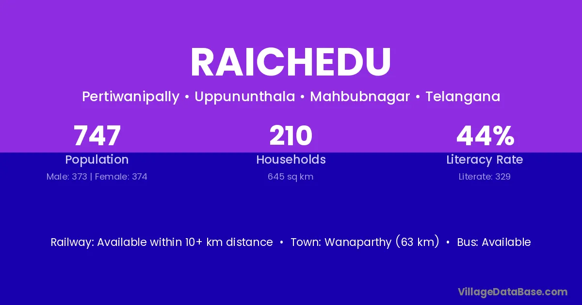 Raichedu village has a total population of 747 people, of which 373 are males and 374 are females.
