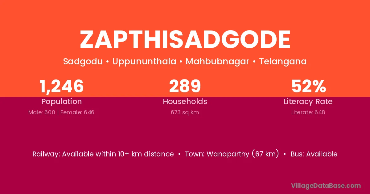 Wanaparthy (67 km) is the nearest town to Zapthisadgode village for major economic activities and is located approximately 67 km away.