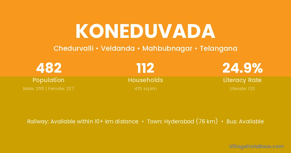 Hyderabad (76 km) is the nearest town to Koneduvada village for major economic activities and is located approximately 76 km away.