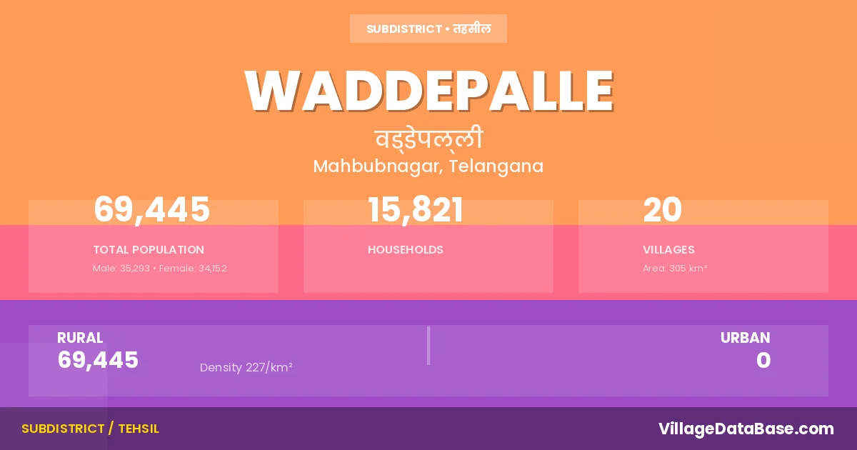 According to the 2011 census The total area of Waddepalle Mandal is 305 km², with a population of 69445 people. The population density is 227 inhabitants per square kilometre, and there are approximately 15821 houses in the sub district.