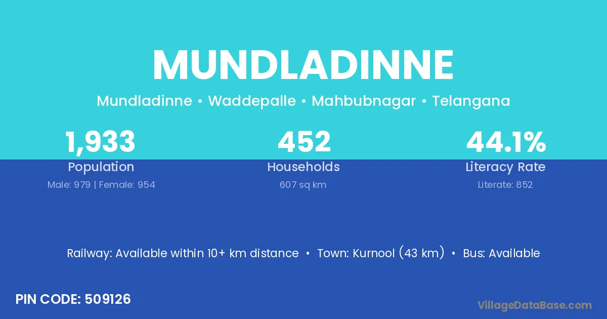 Kurnool (43 km) is the nearest town to Mundladinne village for major economic activities and is located approximately 43 km away.