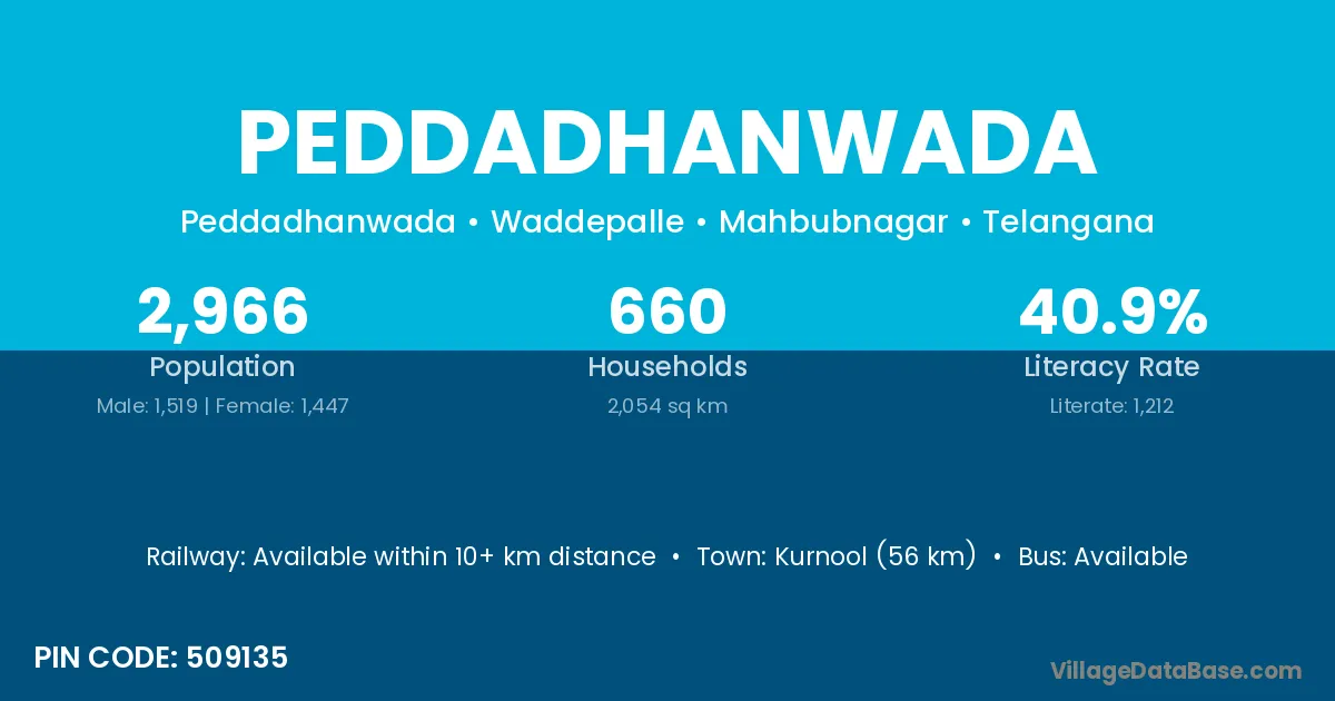 Kurnool (56 km) is the nearest town to Peddadhanwada village for major economic activities and is located approximately 56 km away.
