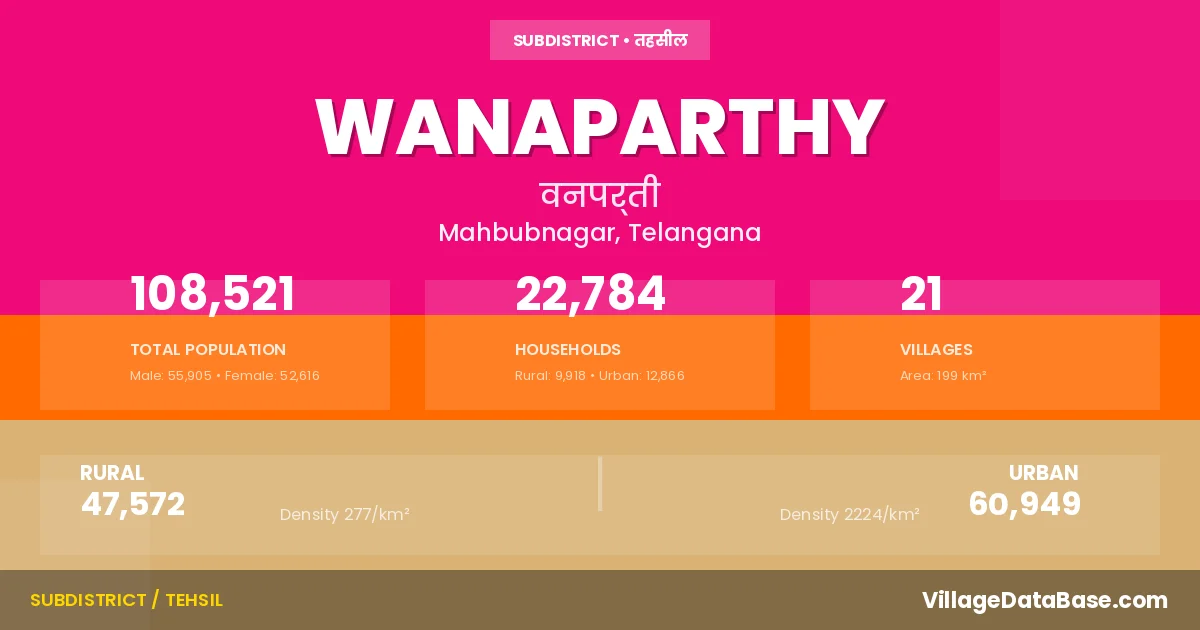 According to the 2011 census The total area of Wanaparthy Mandal is 199 km², with a population of 108521 people. The population density is 546 inhabitants per square kilometre, and there are approximately 22784 houses in the sub district.