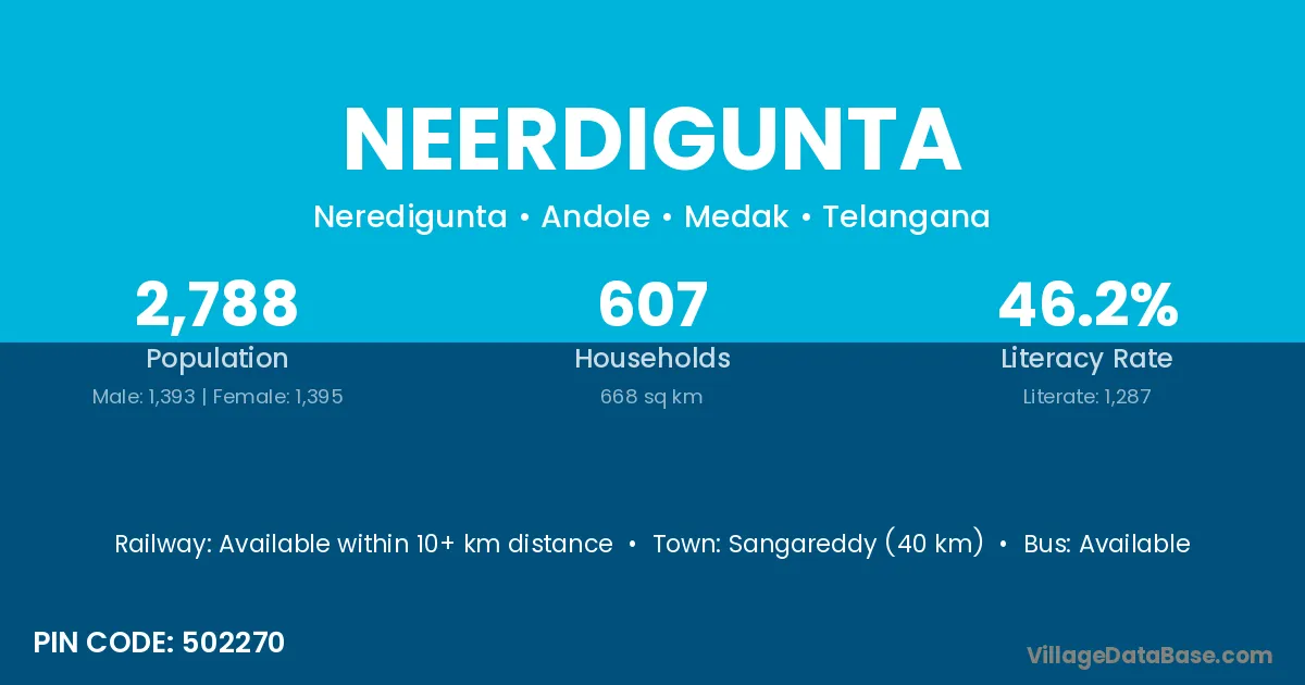 Sangareddy (40 km) is the nearest town to Neerdigunta village for major economic activities and is located approximately 40 km away.