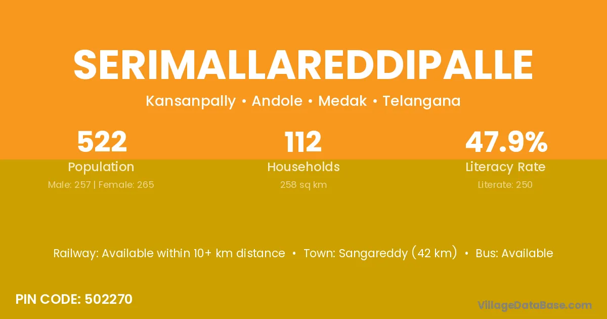 Sangareddy (42 km) is the nearest town to Serimallareddipalle village for major economic activities and is located approximately 42 km away.