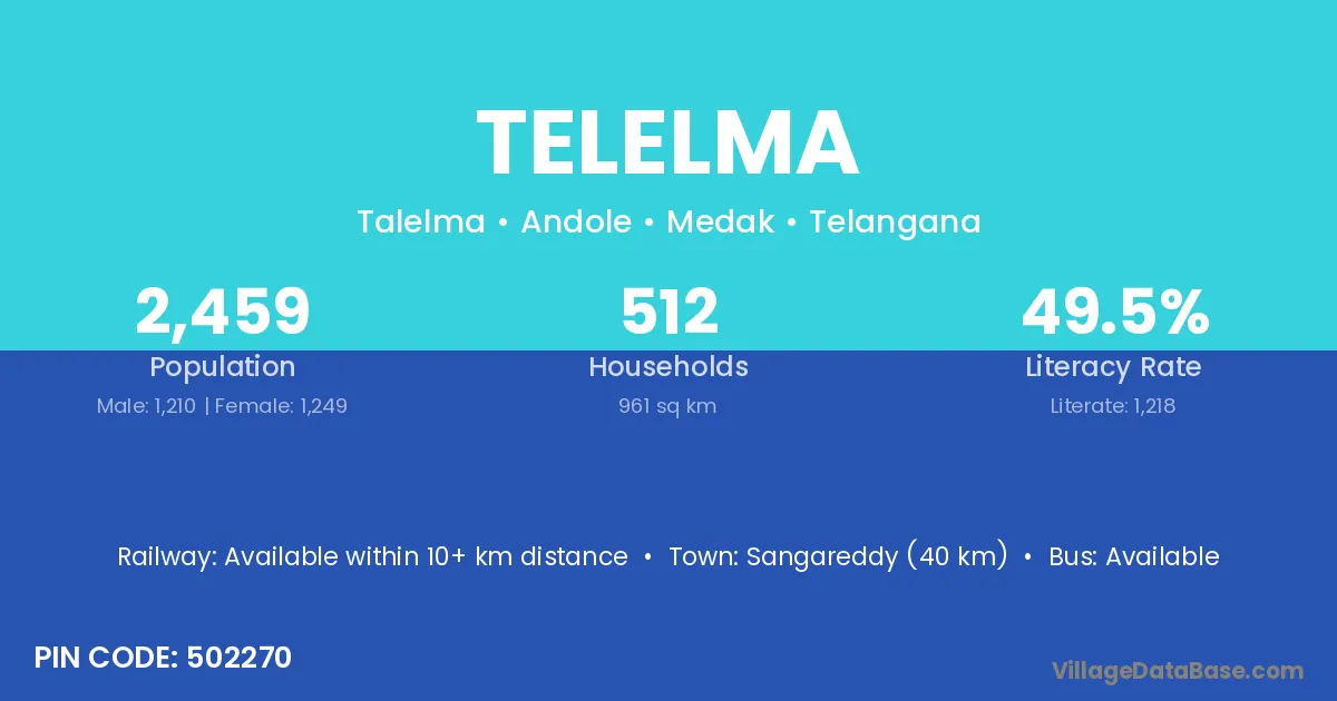 Sangareddy (40 km) is the nearest town to Telelma village for major economic activities and is located approximately 40 km away.