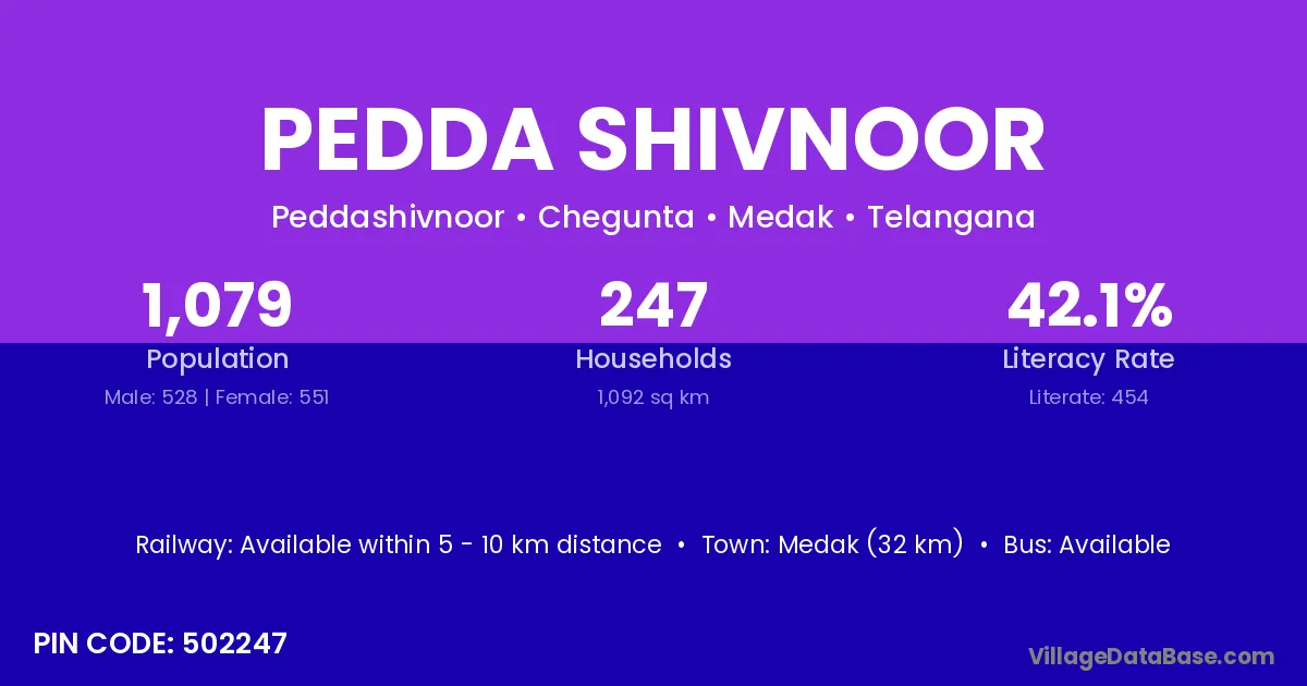 Medak (32 km) is the nearest town to Pedda Shivnoor village for major economic activities and is located approximately 32 km away.