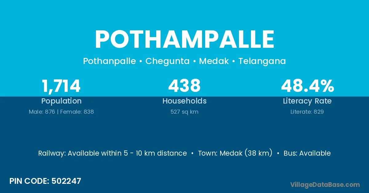 Pothampalle village has a total population of 1,714 people, of which 876 are males and 838 are females.