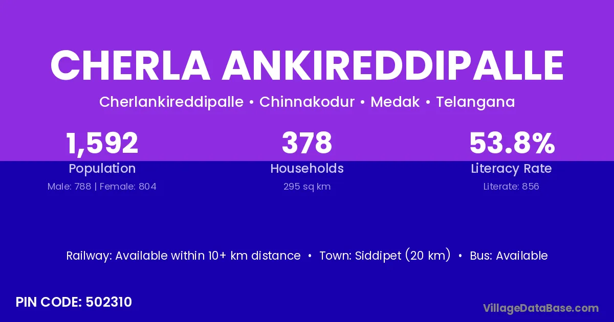 Siddipet (20 km) is the nearest town to Cherla Ankireddipalle village for major economic activities and is located approximately 20 km away.