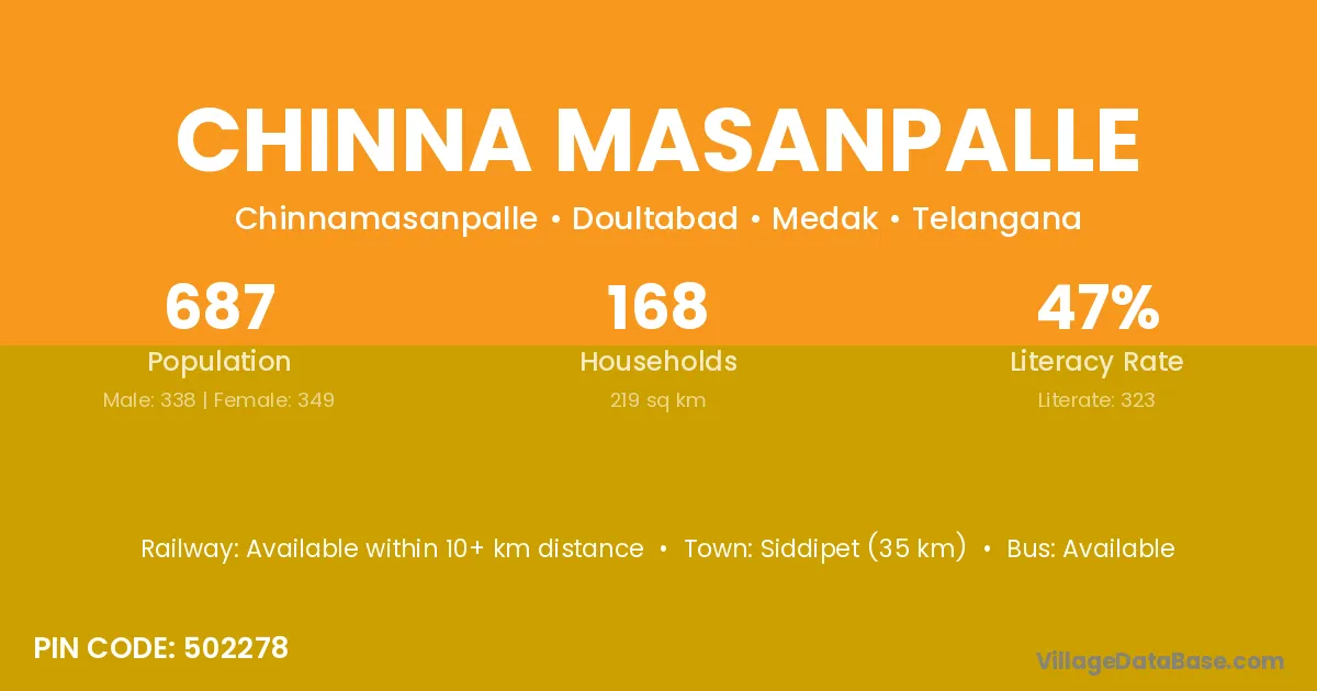 Siddipet (35 km) is the nearest town to Chinna Masanpalle village for major economic activities and is located approximately 35 km away.