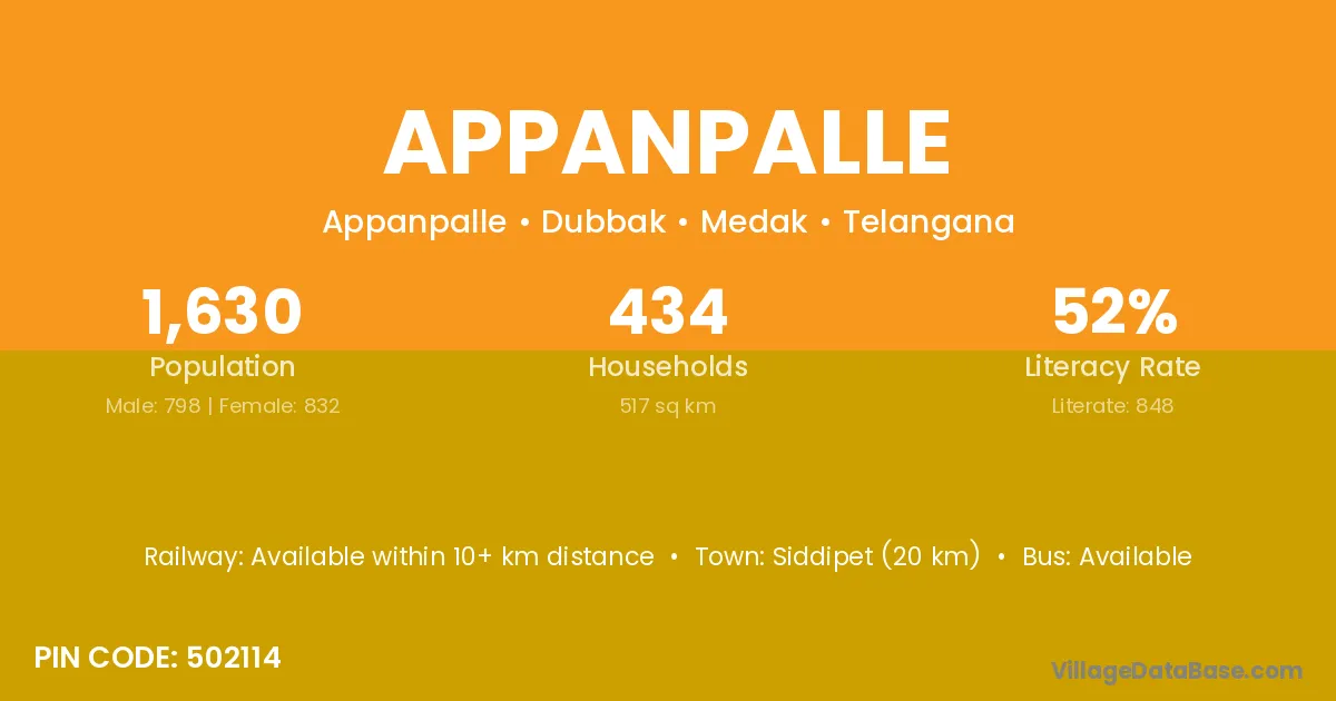 According to Census 2011 information, the village code of Appanpalle village is 502114.