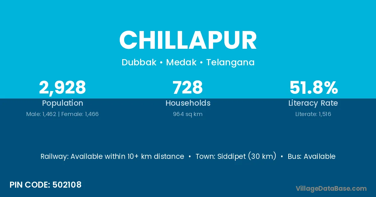 According to Census 2011 information, the village code of Chillapur village is 502108.