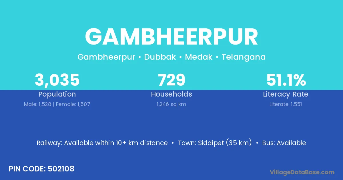 Siddipet (35 km) is the nearest town to Gambheerpur village for major economic activities and is located approximately 35 km away.
