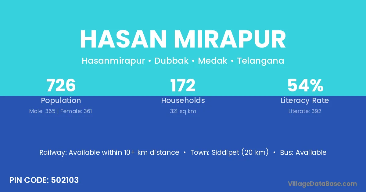 Siddipet (20 km) is the nearest town to Hasan Mirapur village for major economic activities and is located approximately 20 km away.