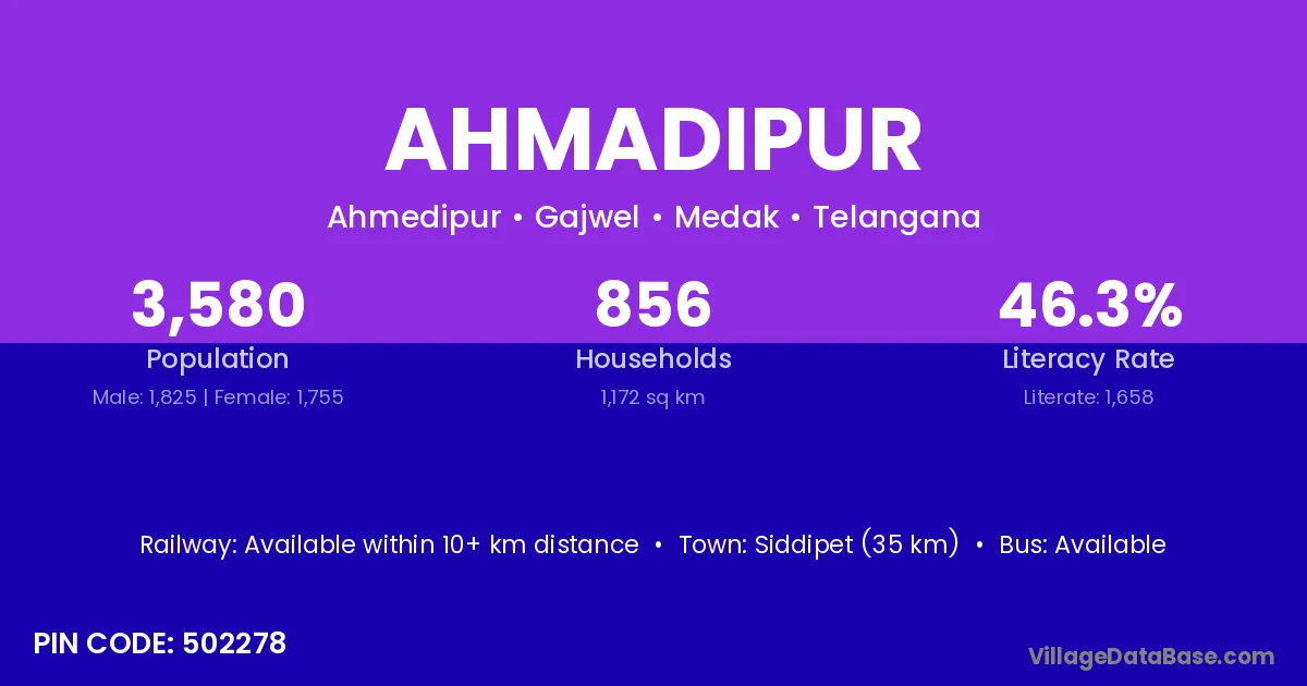 Siddipet (35 km) is the nearest town to Ahmadipur village for major economic activities and is located approximately 35 km away.
