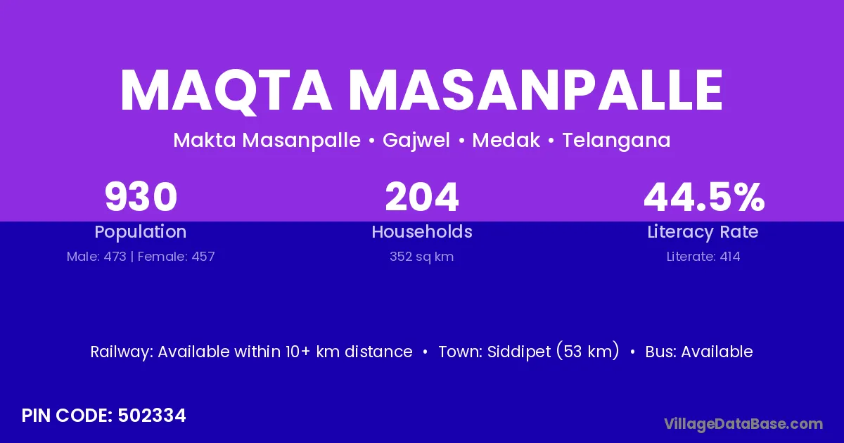 Siddipet (53 km) is the nearest town to Maqta Masanpalle village for major economic activities and is located approximately 53 km away.
