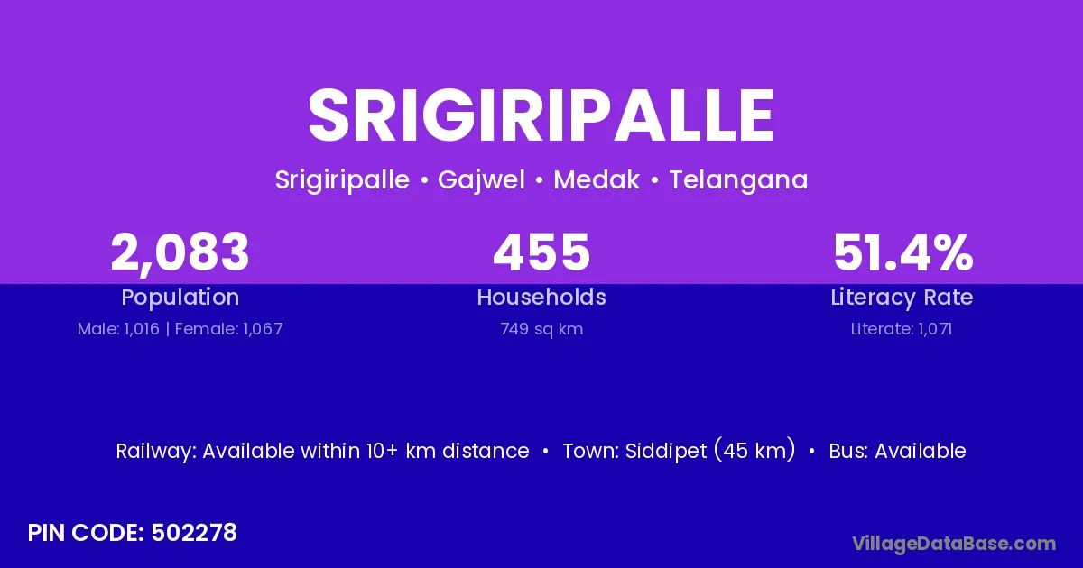 Siddipet (45 km) is the nearest town to Srigiripalle village for major economic activities and is located approximately 45 km away.