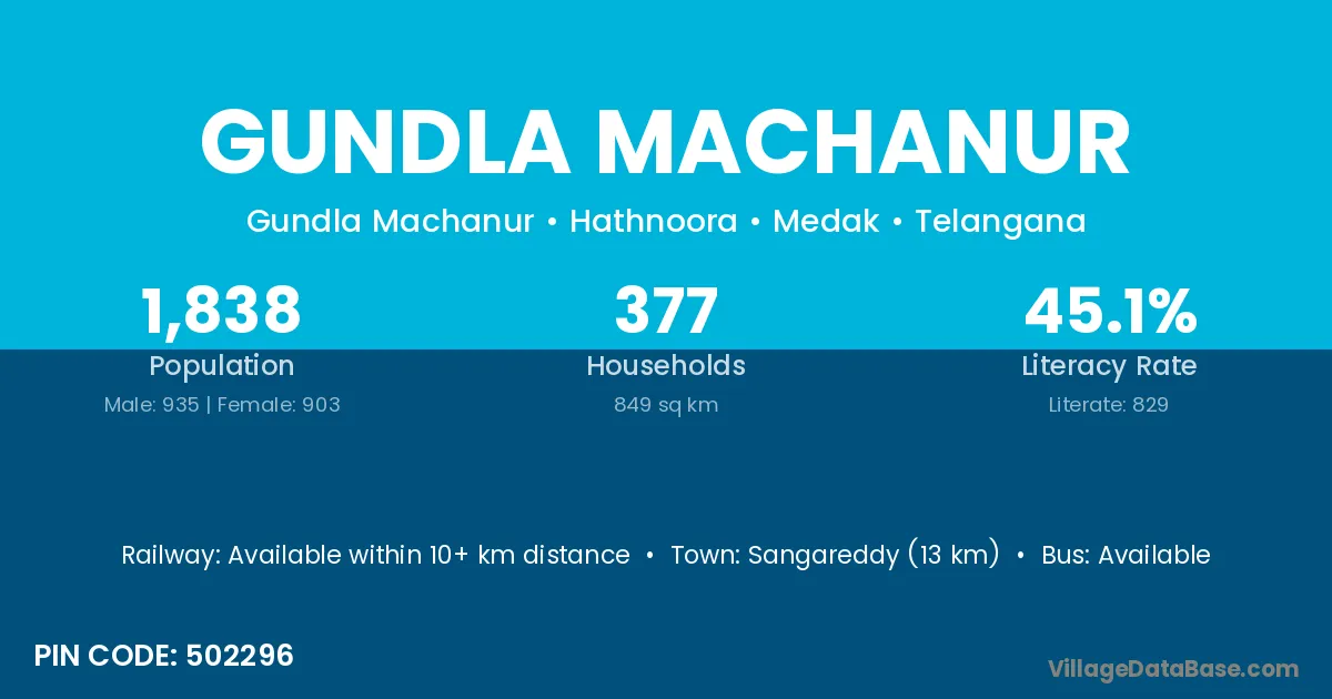 Sangareddy (13 km) is the nearest town to Gundla Machanur village for major economic activities and is located approximately 13 km away.