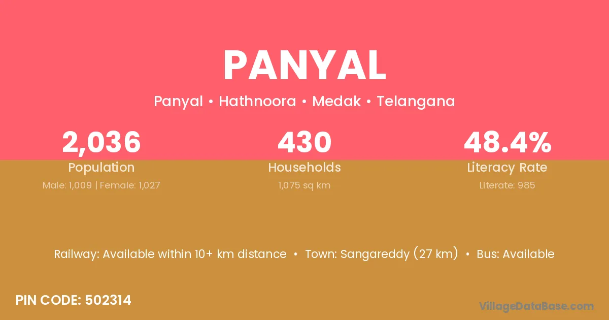 Sangareddy (27 km) is the nearest town to Panyal village for major economic activities and is located approximately 27 km away.