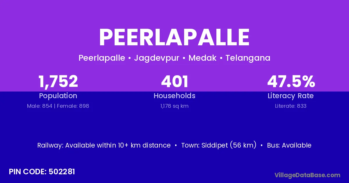 Siddipet (56 km) is the nearest town to Peerlapalle village for major economic activities and is located approximately 56 km away.