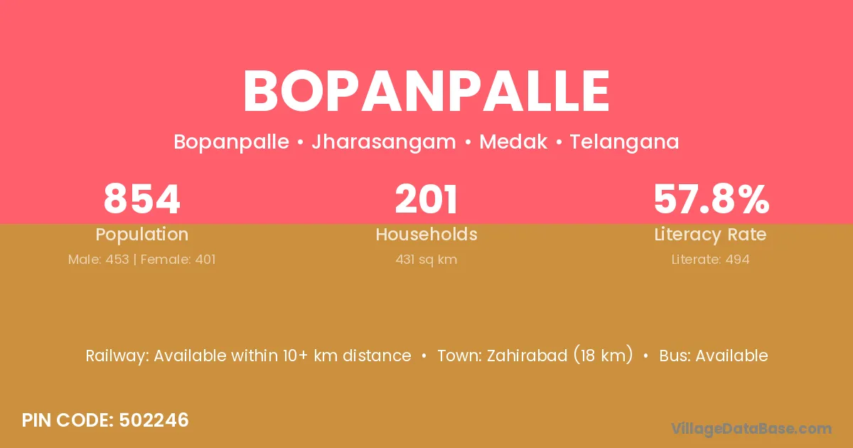Zahirabad (18 km) is the nearest town to Bopanpalle village for major economic activities and is located approximately 18 km away.