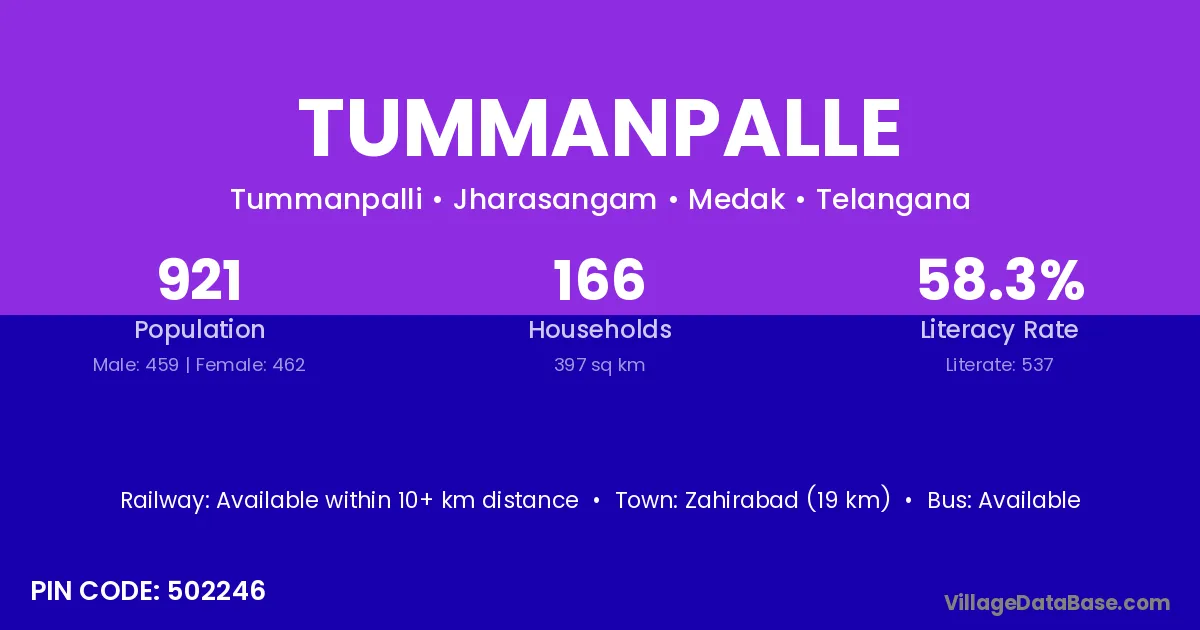 Zahirabad (19 km) is the nearest town to Tummanpalle village for major economic activities and is located approximately 19 km away.