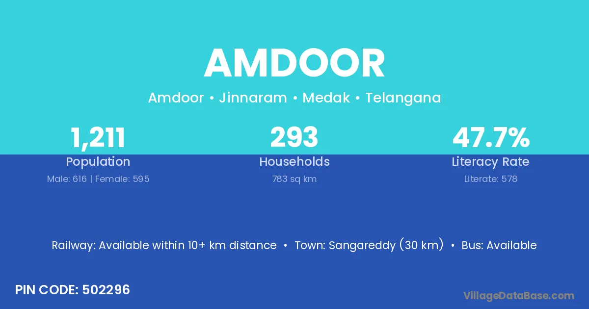 Sangareddy (30 km) is the nearest town to Amdoor village for major economic activities and is located approximately 30 km away.
