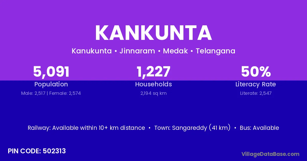 Sangareddy (41 km) is the nearest town to Kankunta village for major economic activities and is located approximately 41 km away.