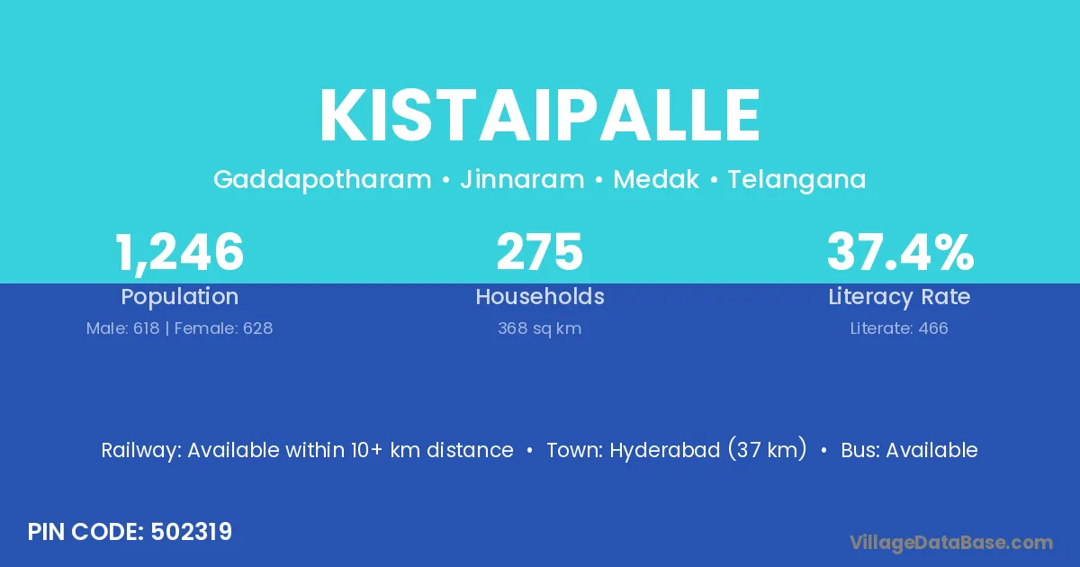 Hyderabad (37 km) is the nearest town to Kistaipalle village for major economic activities and is located approximately 37 km away.