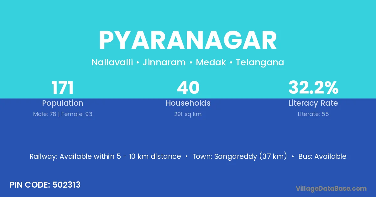 Sangareddy (37 km) is the nearest town to Pyaranagar village for major economic activities and is located approximately 37 km away.