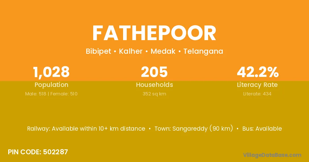 Sangareddy (90 km) is the nearest town to Fathepoor village for major economic activities and is located approximately 90 km away.