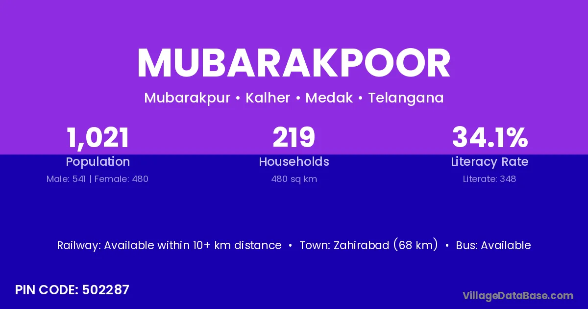 Zahirabad (68 km) is the nearest town to Mubarakpoor village for major economic activities and is located approximately 68 km away.
