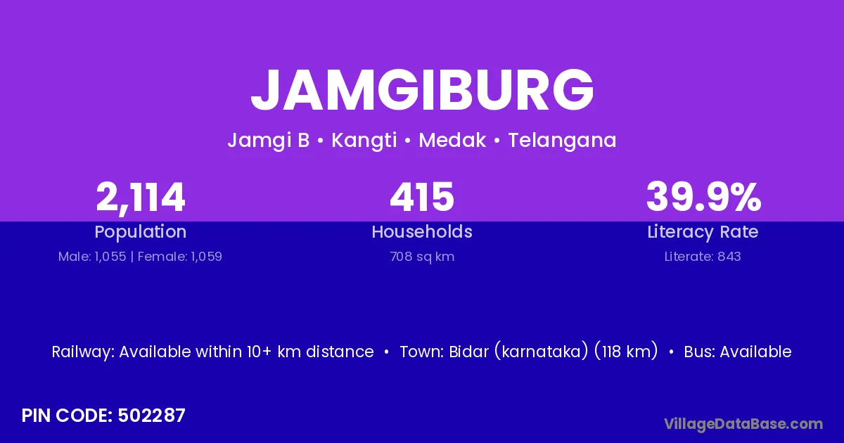 Bidar (karnataka) (118 km) is the nearest town to Jamgiburg village for major economic activities and is located approximately 118 km away.