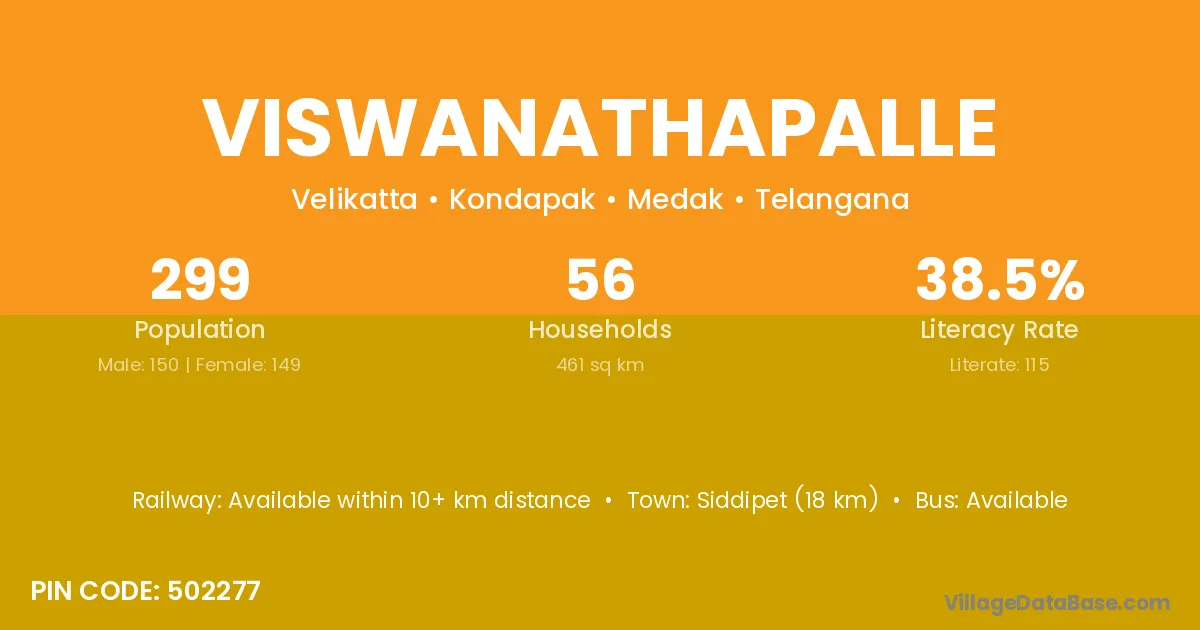 Siddipet (18 km) is the nearest town to Viswanathapalle village for major economic activities and is located approximately 18 km away.