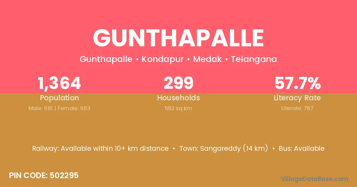 Sangareddy (14 km) is the nearest town to Gunthapalle village for major economic activities and is located approximately 14 km away.