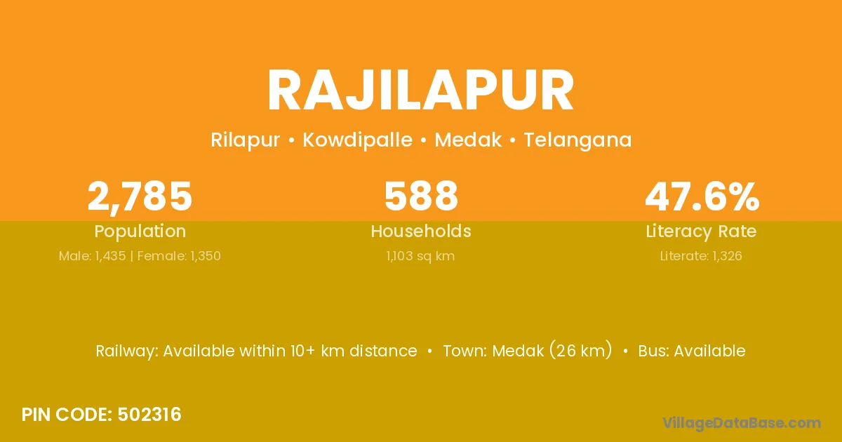 Medak (26 km) is the nearest town to Rajilapur village for major economic activities and is located approximately 26 km away.