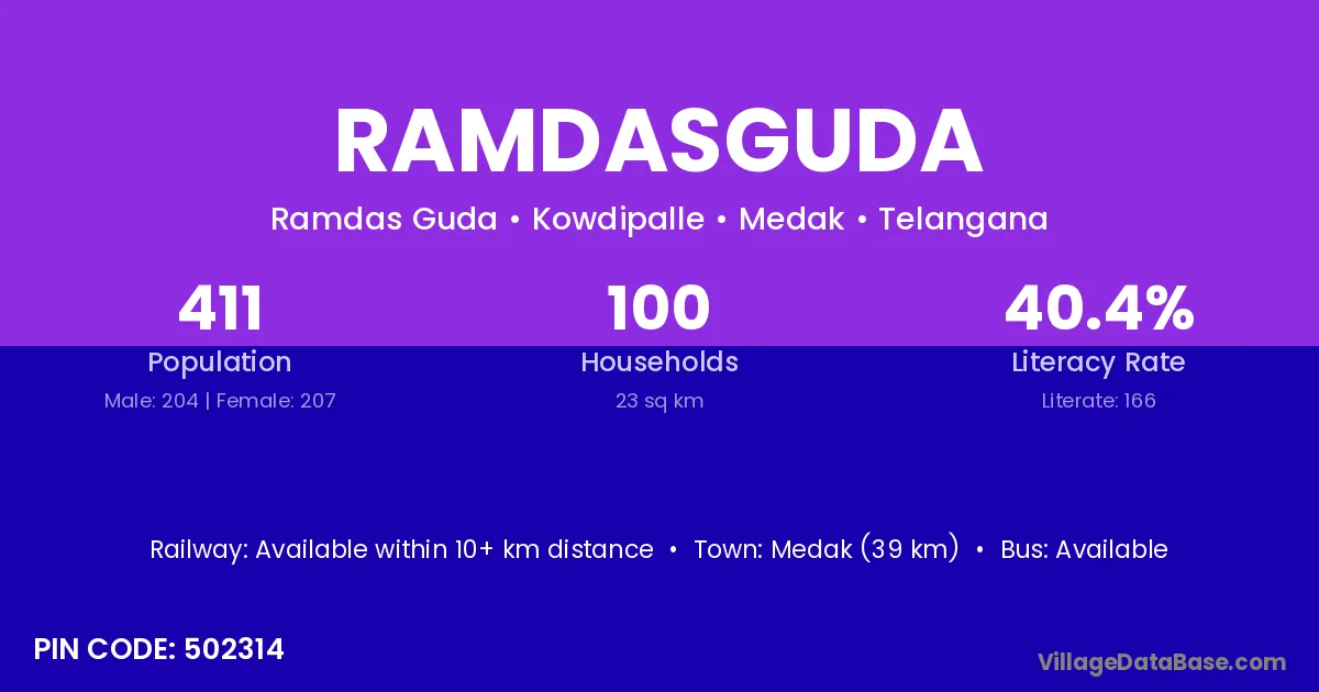 Medak (39 km) is the nearest town to Ramdasguda village for major economic activities and is located approximately 39 km away.