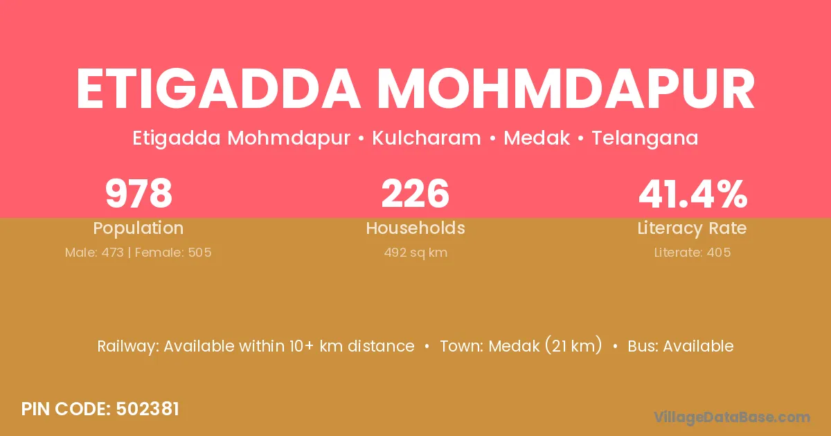 Etigadda Mohmdapur village has a total population of 978 people, of which 473 are males and 505 are females.