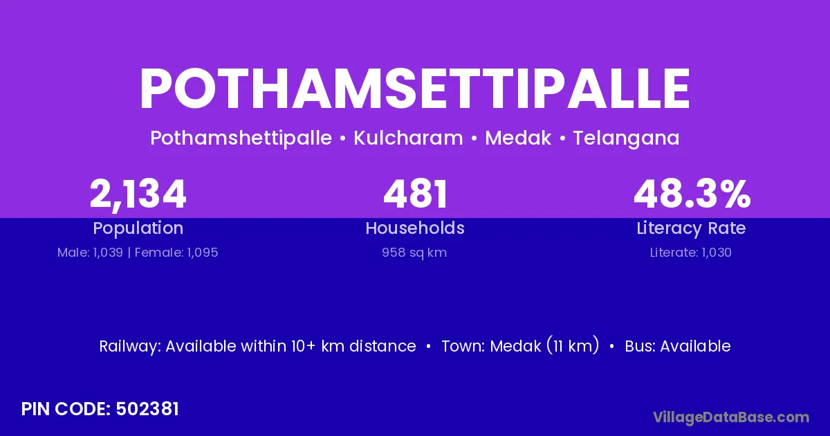 Medak (11 km) is the nearest town to Pothamsettipalle village for major economic activities and is located approximately 11 km away.