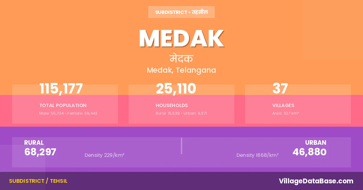 According to the 2011 census The total area of Medak Mandal is 327 km², with a population of 115177 people. The population density is 352 inhabitants per square kilometre, and there are approximately 25110 houses in the sub district.